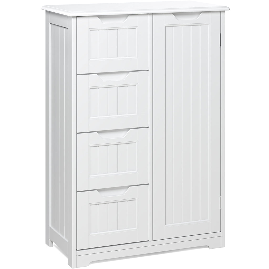 This kitchen pantry features 4 drawers with slide rails, providing a convenient storage solution for small items while keeping them private and free from dust. The pantry cabinet also includes a door and 2 adjustable shelves, allowing for customization to accommodate various items and keep your space neat and organized.