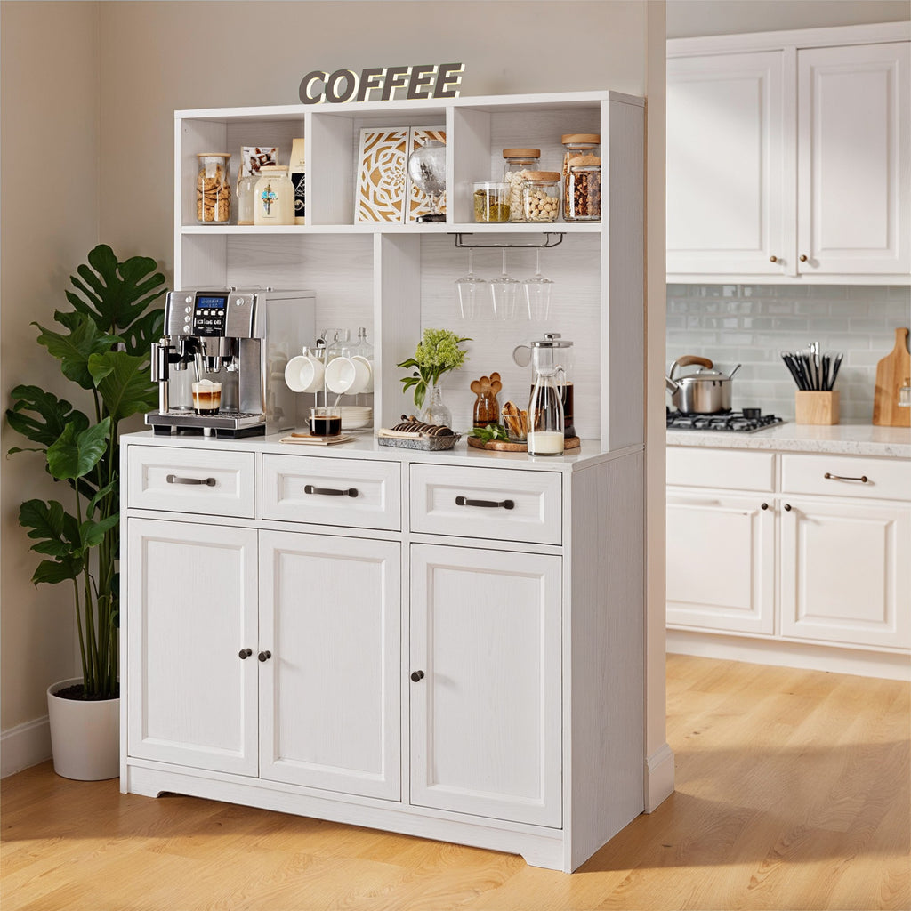 Aiho 60-inch Tall Kitchen Sideboard Seamlessly blending expansive storage with stylish design, this sideboard is the perfect choice to elevate both functionality and aesthetics in your kitchen or dining area. More than just a pantry, it serves as a versatile household hub. Spacious shelves and drawers neatly organize all your groceries, tableware, and small appliances; the sturdy top surface creates an ideal coffee bar or prep area; while the specially designed microwave stand ensures safe and convenient food heating. Its modern minimalist style effortlessly complements any home decor, making it a practical and stylish focal point whether placed in the kitchen, dining room, or even the living room. The Aiho sideboard helps you bid farewell to clutter and embrace an elegantly organized lifestyle.
