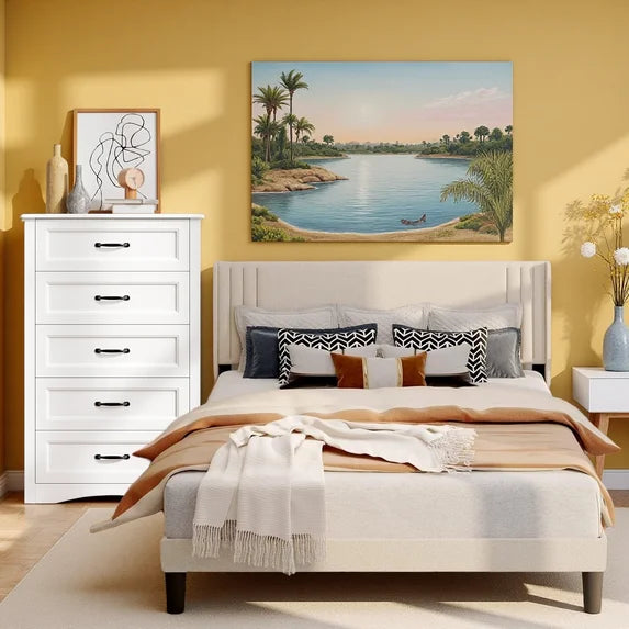 Lofka 2 Pieces Bedroom Furniture Set,Includes Queen Size Bed Frame with Headboard,Nightstand Set of 1, Begie/White
