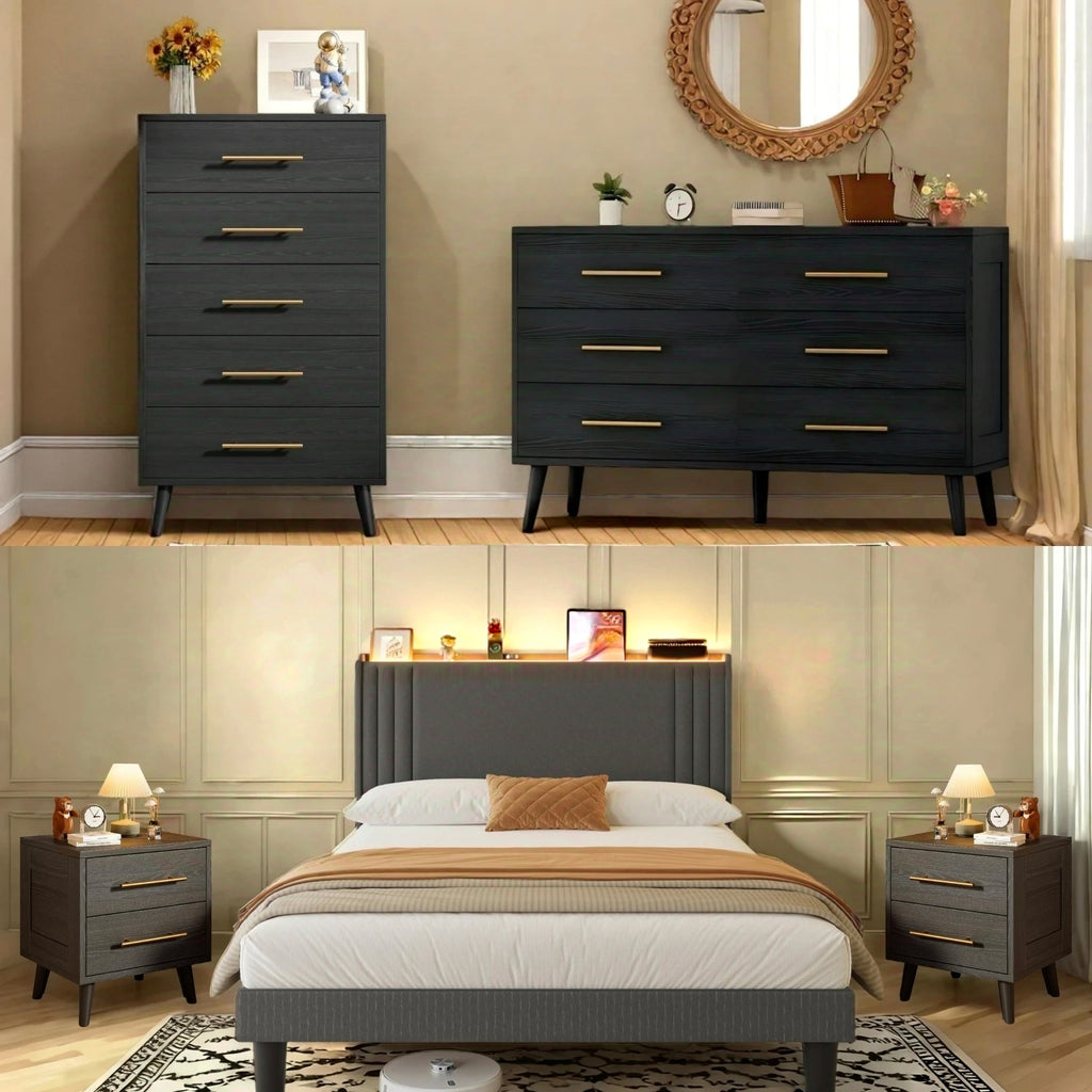 This complete bedroom furniture set includes a full-size bed frame with LED light strips+2 stylish nightstands+a spacious 5 drawer dresser, and a 6 drawer chest. ✨This bedroom Set will be sent out in 5 packages and arrival may vary.