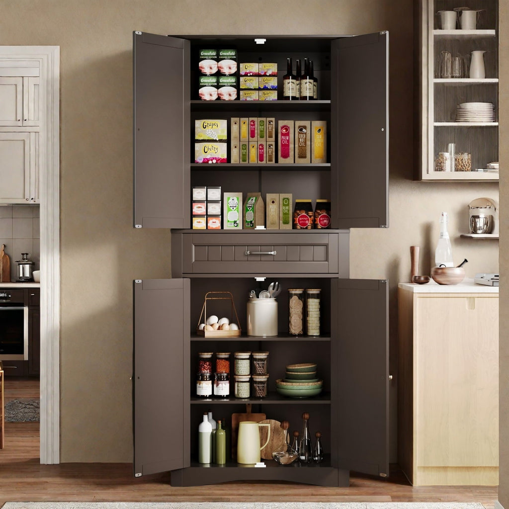 Pantry Cabinet,Lofka-71in KitchenPantry Storage Cabinet with Upper and Lower Doors and Split Drawer Design, Dark Brown