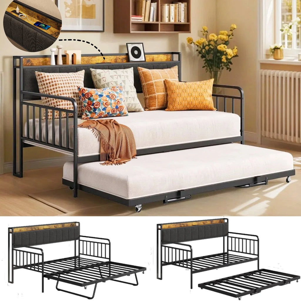Lofka Daybed with Charging Station, Twin Metal Daybed with Pop Up Trundle Bed, Metal Sofa Bed Frame with Steel Slat Support for Living Room, Bedroom and Guest Room,Grey