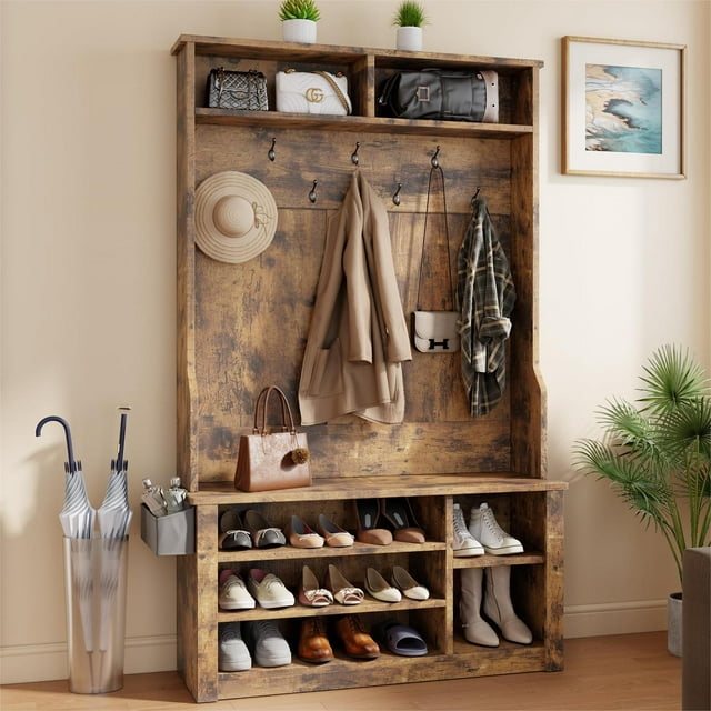 Lofka 5-in-1 Hall Tree with Bench and Shoe Storage, Entryway Hall Tree with Coat Rack, Adjustable Shoe Storage, 2-tier top storage