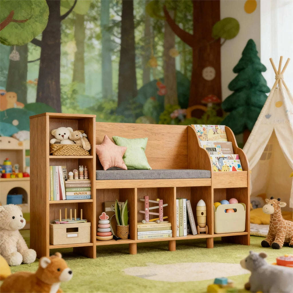 Designed with love and functionality in mind, this all-in-one kids storage bookshelf offers ample space for books, toys, and treasures, while the charming built-in reading nook creates the perfect spot for storytime. Measuring just the right height for little ones (31.5" tall), it encourages independence and a love for reading—all while keeping their space tidy and stylish.