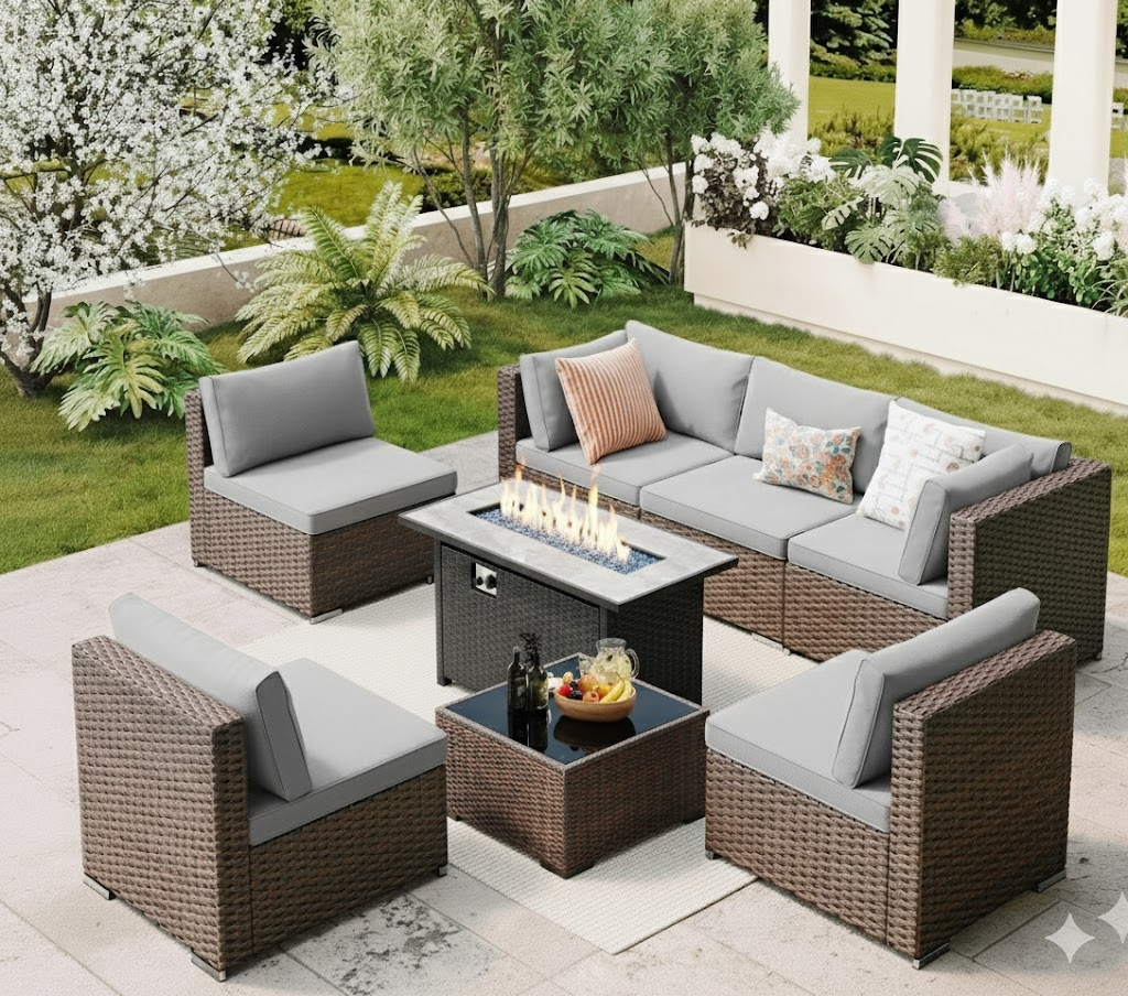 ☀️ Noelse 8-Piece Patio Furniture Set with Fire Pit Table — Comfort Meets Style in Every Season