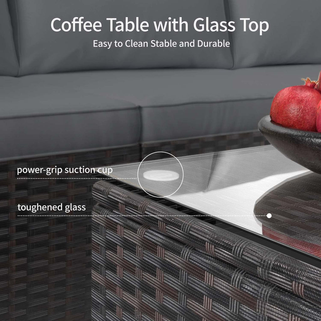 Transform your living space, bring home comfort and style with our outdoor furniture set. Designed for comfort and durability, this pe rattan porch furniture brings a modern touch to your outdoor living space. Perfect for entertaining guests or enjoying quiet moments with family, this modular outdoor sofa can be arranged in multiple layouts to match your space and mood. Plus, the soft yet supportive cushions are removable and machine washable for easy care. The patio set includes: 1 corner chair, 1 armless chair, 1 Ottoman, 1 tempered glass top coffee table