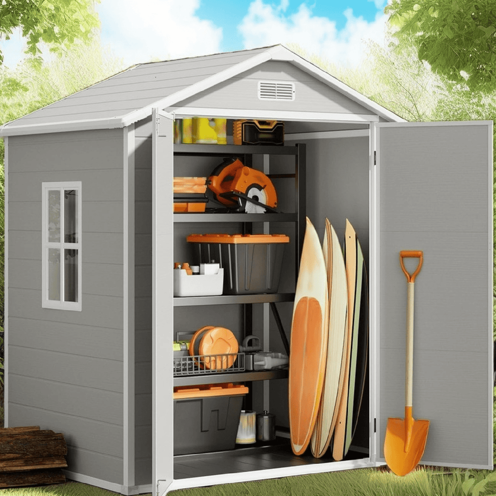 This 6' x 4' outdoor storage shed is the ideal storage solution for small gardens or areas with limited space. Durable construction and high quality resin materials make this storage shed rust- and UV-resistant. The sloped roof adds extra storage space, prevents rainwater from collecting and protects against rust. Lockable doors provide extra security. This outdoor storage shed is the perfect size for storing bicycles, lawn mowers, grills, and gardening tools. Perfect for your garden, backyard, lawn and any outdoor space you desire.