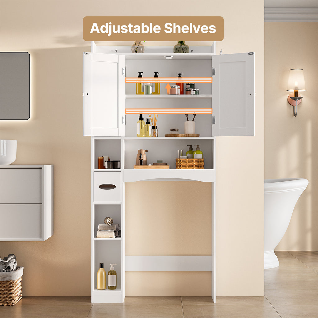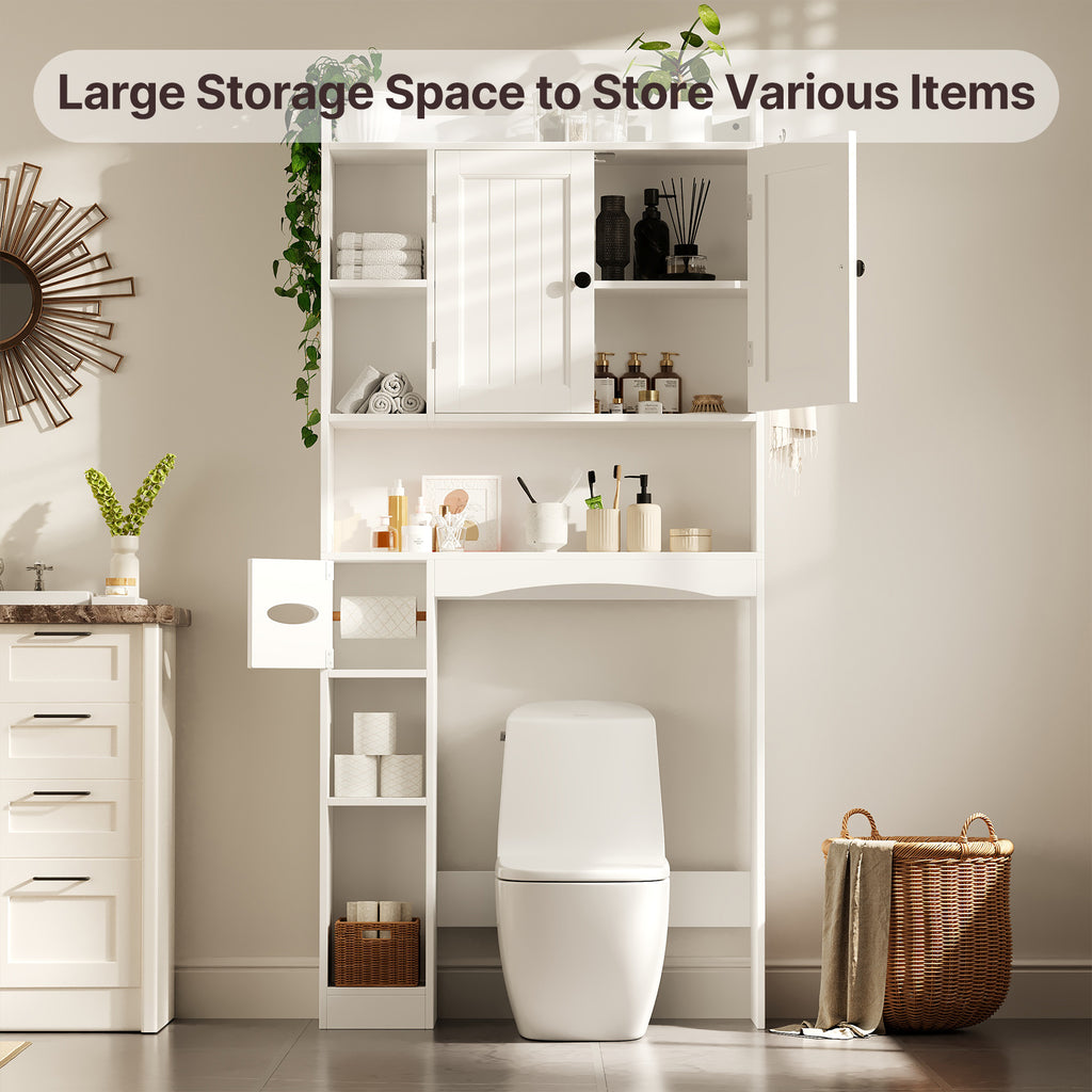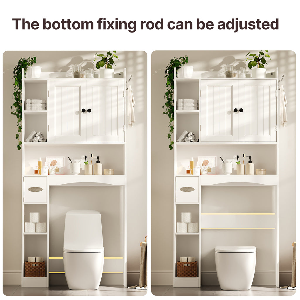 Over The Toilet Storage Cabinet with 2 Doors, Paper Holder and Racks, Adjustable Shelf, Bottom Bar, for Bathroom, Laundry - White