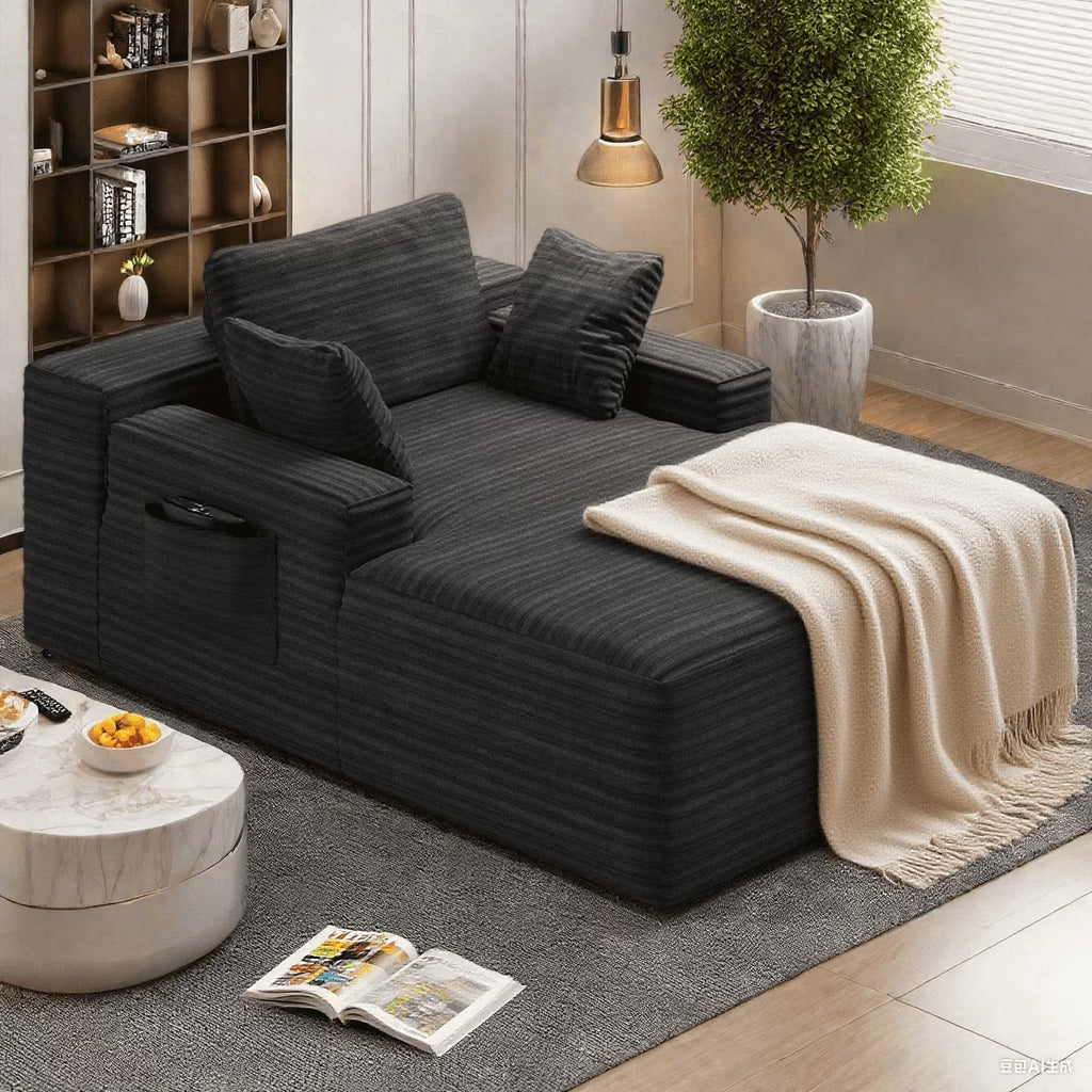 Oversized Sleeper Sofa, Lofka 66" Depth Corduroy Upholstered Chaise Lounge with Pillows and Side Pocket, Indoor, Black