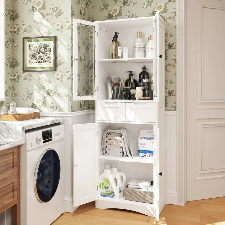 Pantry Cabinet, Asofer 67" Tall Storage Cabinet with Glass Door & 2 Drawers, Freestanding Cupboard for Dining Room (White)