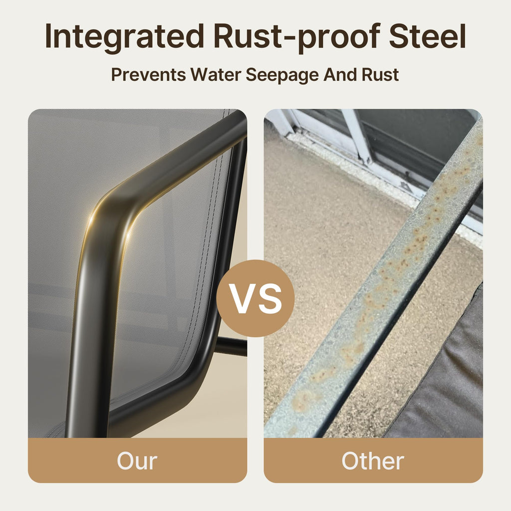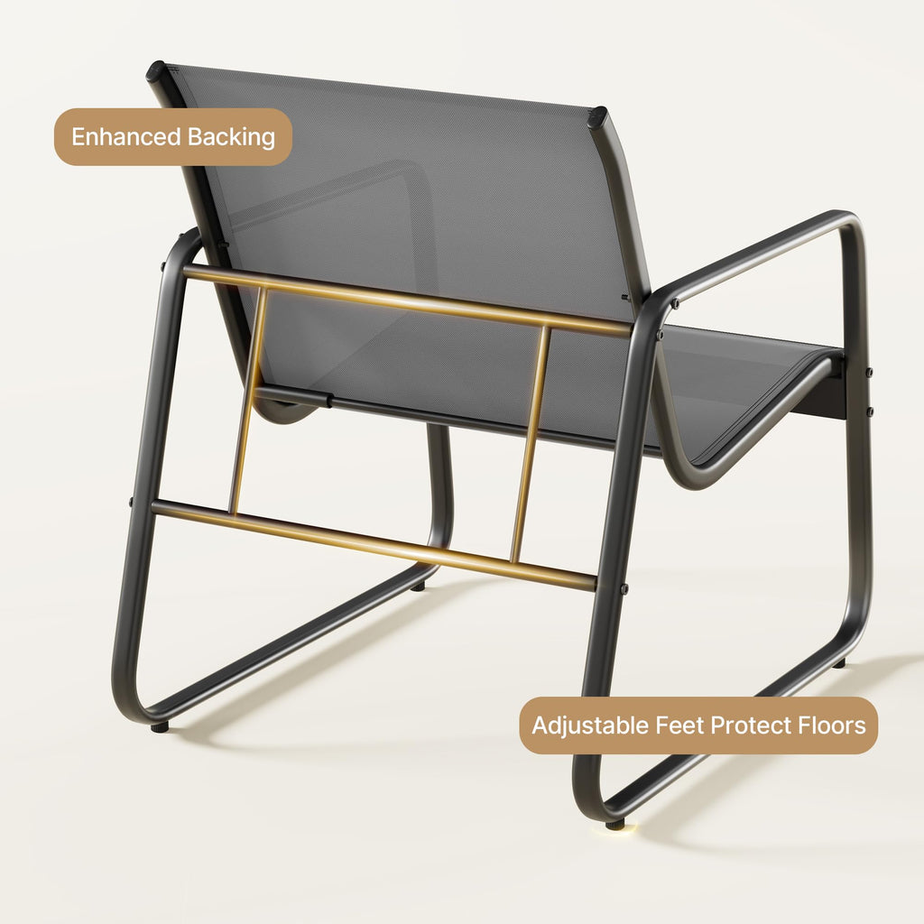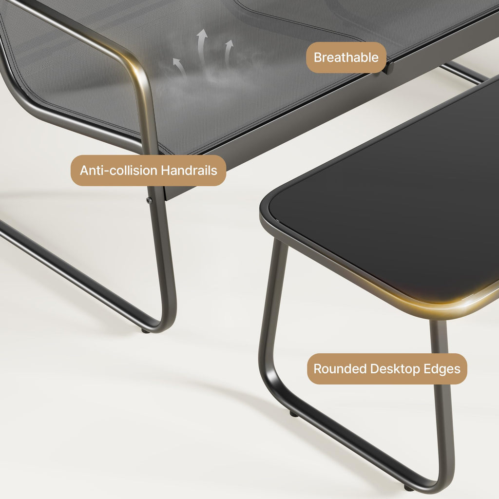 Transform your living space, bring home comfort and style with our outdoor furniture set, this stylish 4-piece balcony furniture includes a loveseat, two single chairs, and a tempered glass table - perfect for intimate gatherings or solo relaxation. Featuring premium breathable textilene fabric that stays cool in summer and a heavy-duty rust-resistant steel frame, this small patio furniture set combines comfort with durability. The safety-tempered glass tabletop and curved edges ensure worry-free use, while the adjustable spiral feet provide stability on any surface. Easy to assemble and designed for years of enjoyment