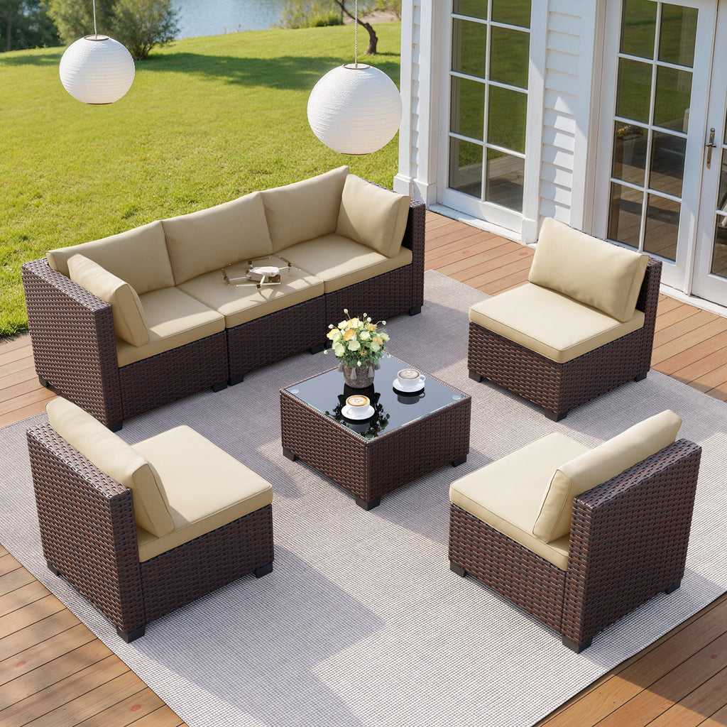 ??Versatile and adaptable, this 7-piece set features a modular L-shaped design that easily fits any configuration, perfect for intimate gatherings or spacious entertaining. Enjoy ultimate comfort with waterproof, fade-resistant cushions that are removable for easy cleaning. Plus, the tempered glass coffee table provides an elegant surface for drinks and snacks.