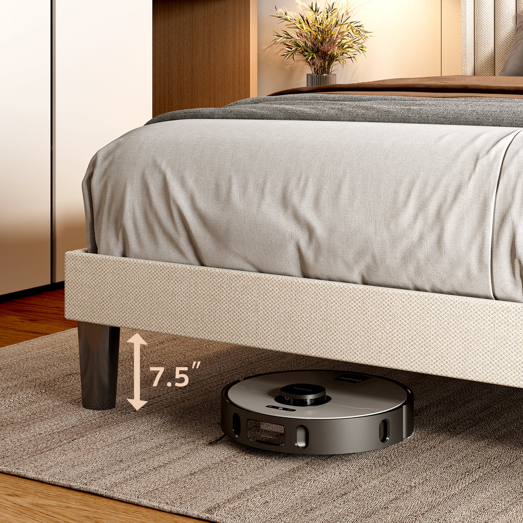 【Low-center-of-gravity design】After extensive testing, we've found that a 7.5-inch gap under the bed lowers the mattress's center of gravity, enhancing the stability of the platform bed. Besides, you can make the most of the space underneath for storing extra clothes and everyday items. A robot vacuum can easily get in there, eliminating those hard-to-reach spots and keeping your room clean.