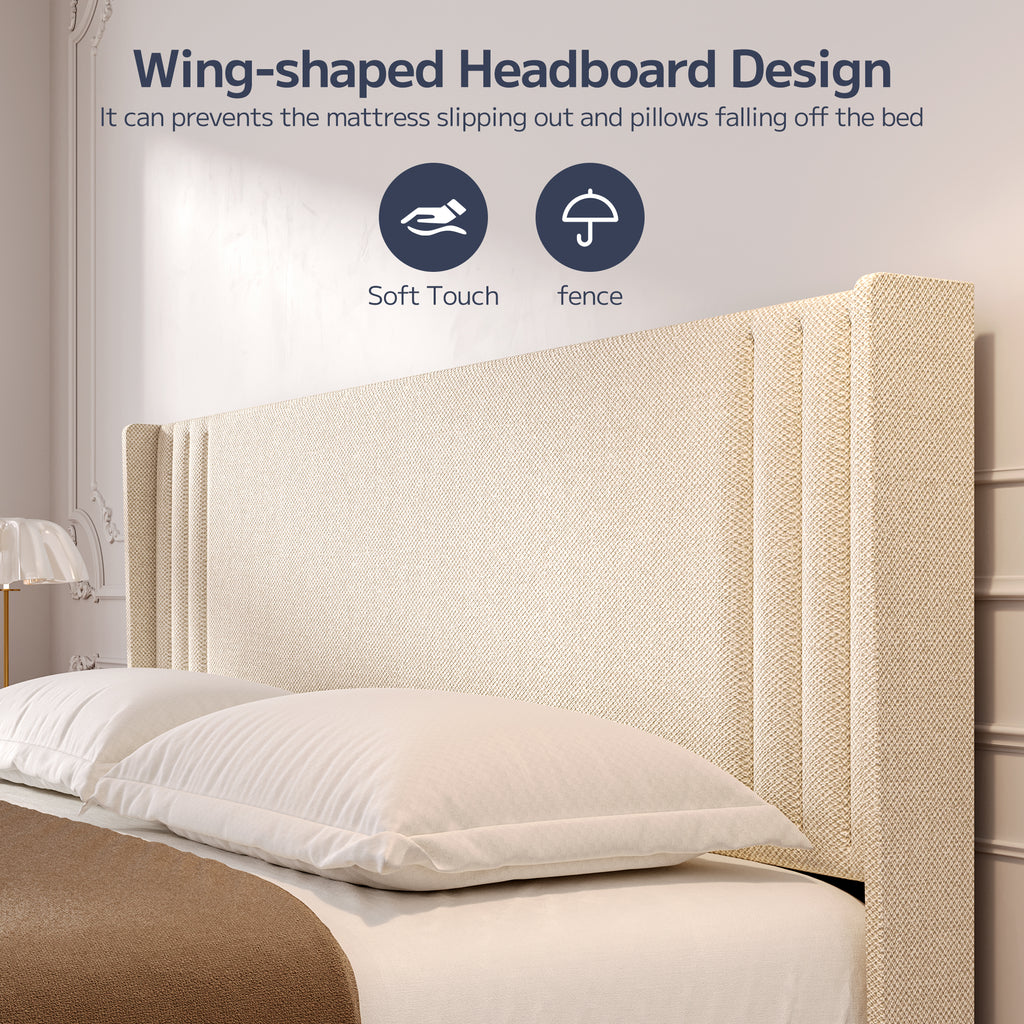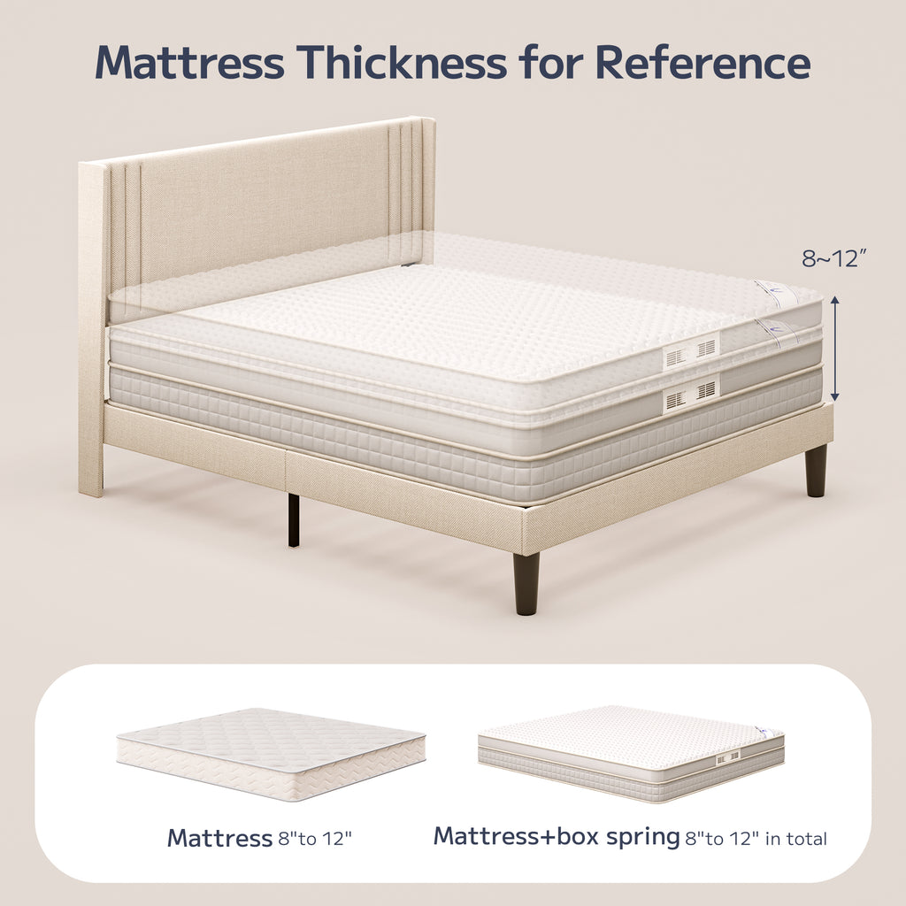 🌇【Wingback Headboard】The wing-shaped headboard design prevents the mattress from shifting. The thick headboard padding is made from breathable cotton-linen fabric and wrapped with high-resilience memory foam, skin-friendly, providing better support for your back and shoulders, relieving fatigue.