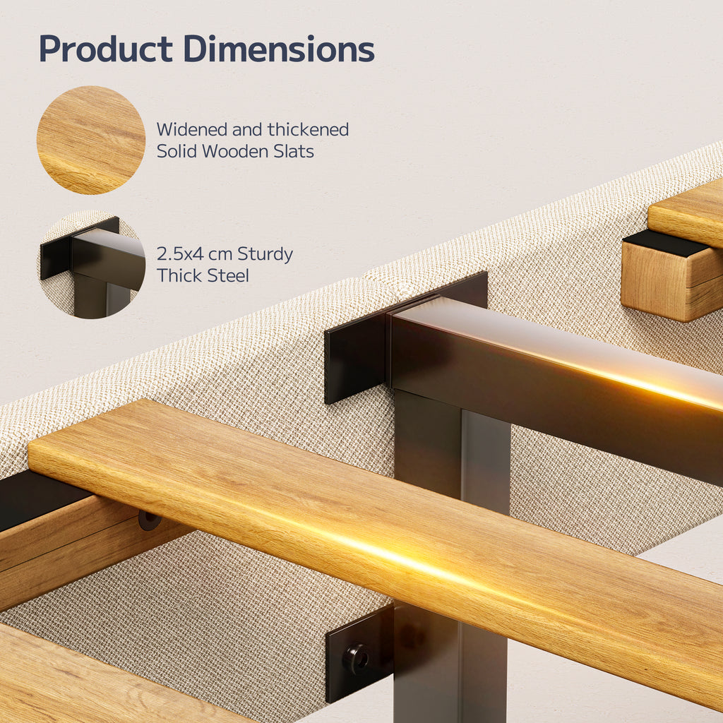 Material: Premium Upholstery + Reinforced Steel + Solid Wood Slats