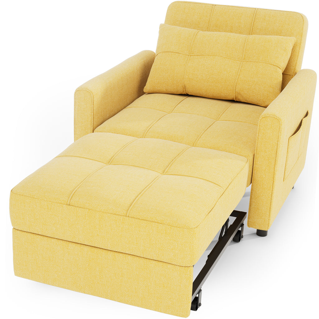 Sofa Bed Chair Convertible, Sleeper Chair with Pull-Out Bed, 3-in-1 Futon Couch with Reclining Backrest and Side Pocket, Yellow