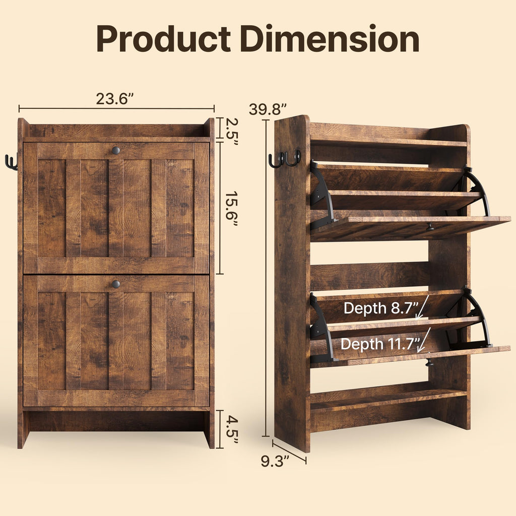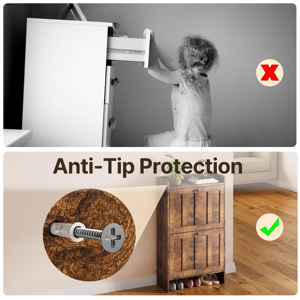 Transform Your Living Space, Bring Home Comfort and Style with Our Shoe Organizer, The Shoe Cabinet Storage for Entryway Keeps Shoes and Small Items Tidy While Saving Space. The Two-Tier Flip Drawers of The Entryway Shoe Storage Cabinet Fit Flats, Heels, Kids' Shoes, or Slippers, and the Open-Top Shelf Offers Quick Access to Everyday Essentials. Crafted from Sturdy MDF Wood with a Minimalist Leg Design, The Shoe Storage Organizer Complements Farmhouse, Modern, or Rustic Decor. Plus, The Entryway Cabinet with The Anti-Tip Kit Ensures Safety for Families and Pets. Easy to Assemble and Perfect for Entryways, Porches, Foyer, Hallway, Living Room, Balcony, Bedroom, or Closets!