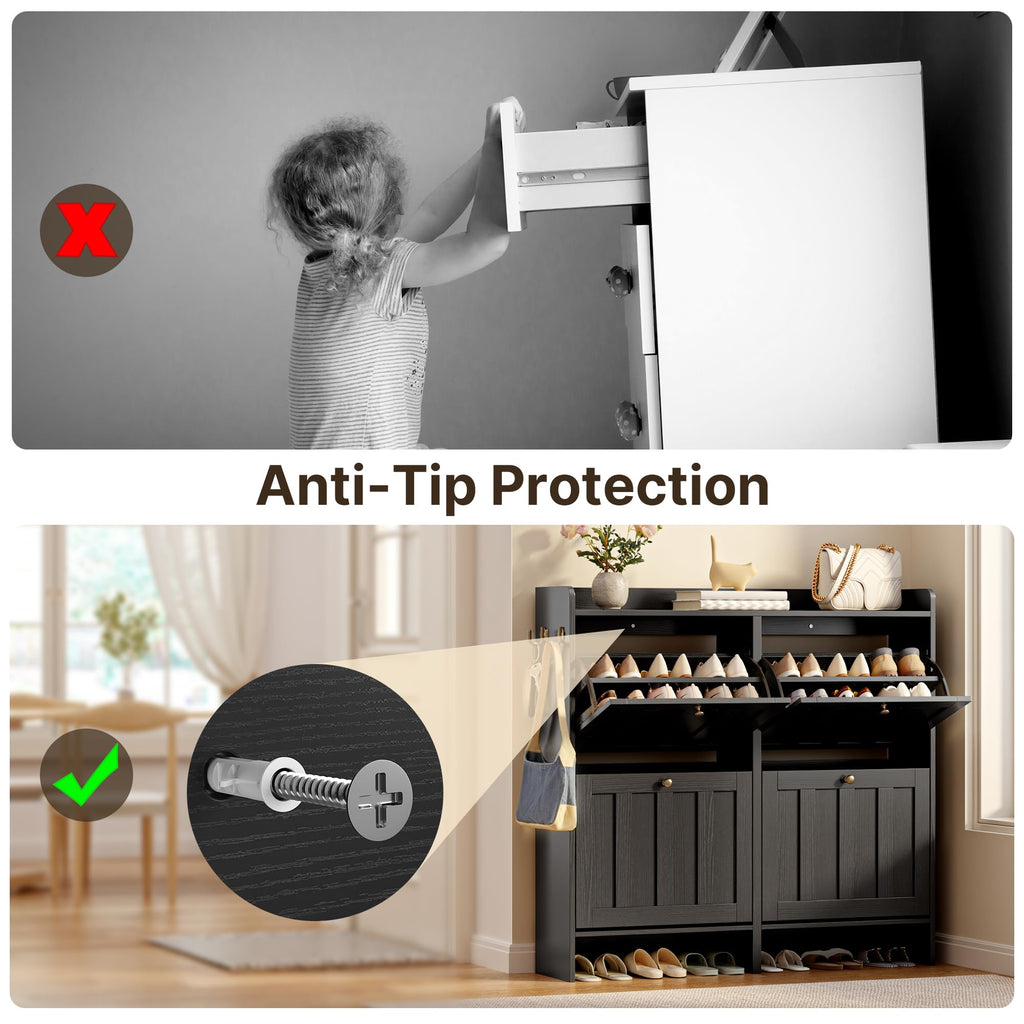 Transform Your Living Space, Bring Home Comfort and Style with Our Shoe Organizer, The Shoe Cabinet Storage for Entryway Keeps Shoes and Small Items Tidy While Saving Space. The Two-Tier Flip Drawers of The Entryway Shoe Storage Cabinet Fit Flats, Heels, Kids' Shoes, or Slippers, and the Open-Top Shelf Offers Quick Access to Everyday Essentials. Crafted from Sturdy MDF Wood with a Minimalist Leg Design, The Shoe Storage Organizer Complements Farmhouse, Modern, or Rustic Decor. Plus, The Entryway Cabinet with The Anti-Tip Kit Ensures Safety for Families and Pets. Easy to Assemble and Perfect for Entryways, Porches, Foyer, Hallway, Living Room, Balcony, Bedroom, or Closets!