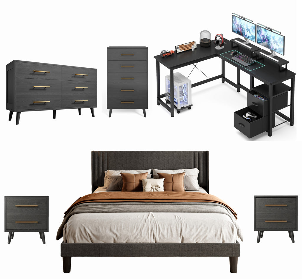 Ultimate Black Office/Gaming Bedroom Set: Complete Setup with L-Desk, King Bed Frame, 2 Nightstands and 2 Drawer Cabinets