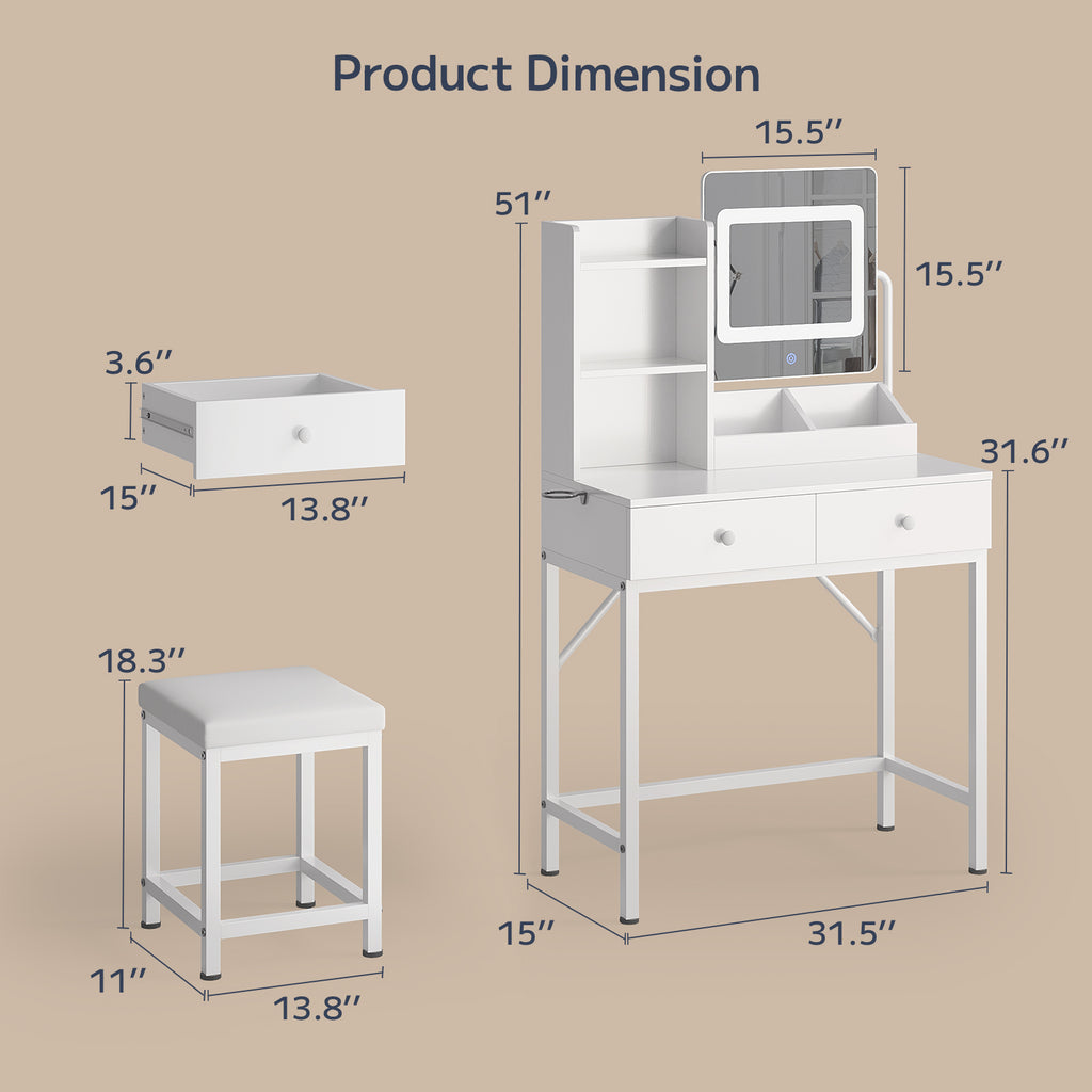 Vanity Desk with Mirror and Lights, Asofer Makeup Vanity Set with 2 Drawers for Bedroom Bathroom, White