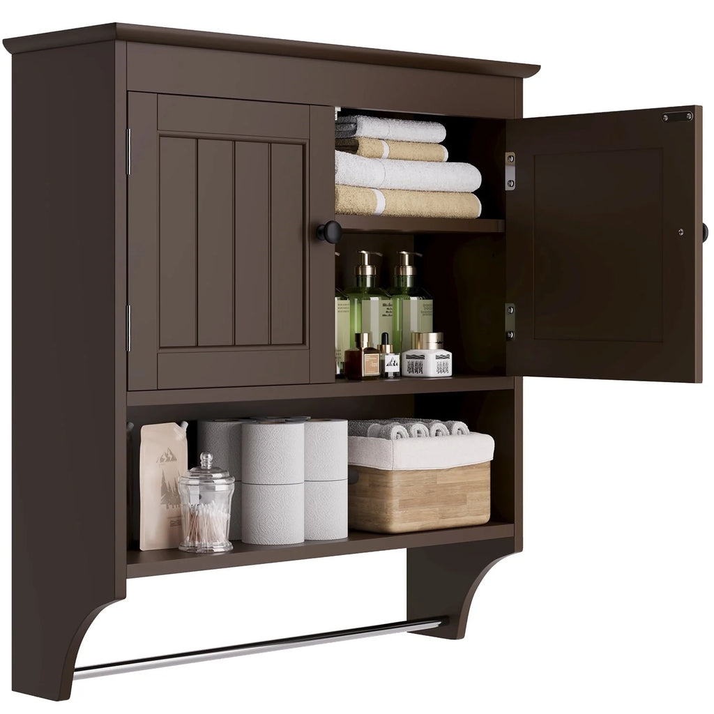 This wall-mounted cabinet is sturdy and durable, designed to save space while providing ample storage. It features a towel rack, an open shelf, and a hidden storage area with double doors, ensuring all your toiletries and skincare products have a proper, dry place to be stored. Its minimalist design is aesthetically pleasing and complements various room styles. The waterproof and rust-resistant exterior is easy to maintain.